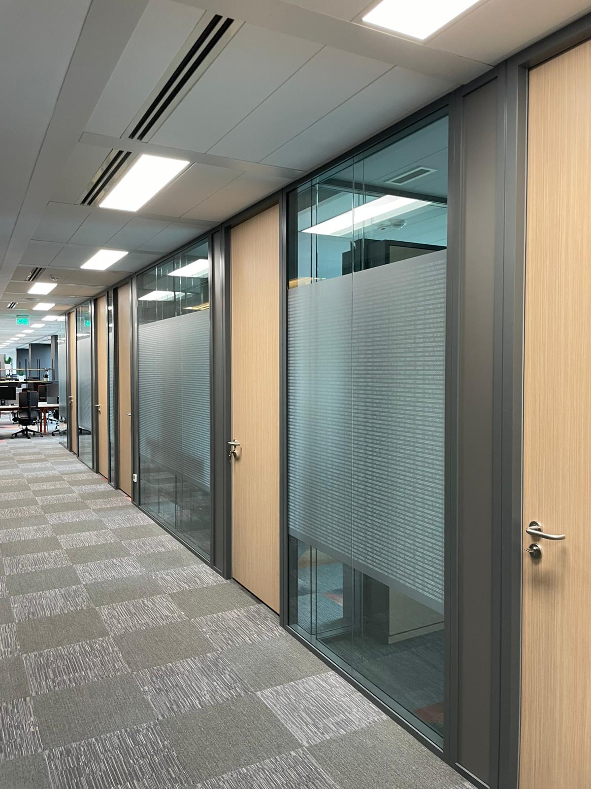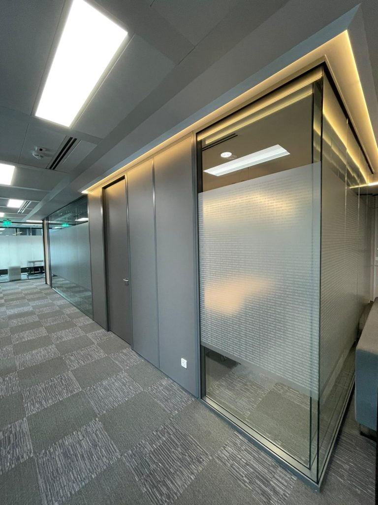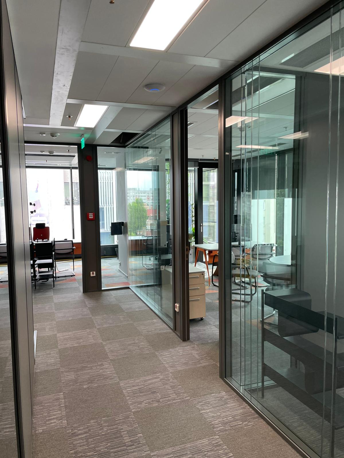 Firma noastra va propune sistemul OMEGA 100 Single Glass pentru o realizare clasica a unei partitii interioare cu un design placut si eficient, folosind pereti relocabili Interfinish cu o singura foaie de sticla.